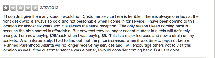 The “story bank” is a public relations operation. But check out these stories shared by Planned Parenthood patients on Yelp, a popular online customer review application, that won’t be disseminated by Planned Parenthood’s powerful public relations operation.