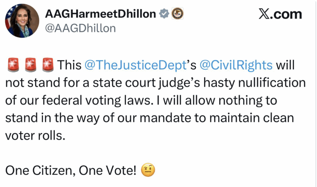 Gardon specifically claimed Assistant Attorney General for Civil Rights at the U.S. Department of Justice Harmeet Dillon, who expressed concern about the judge’s recent “hasty nullification of our federal voting laws,” “publicly targeted this judge.”