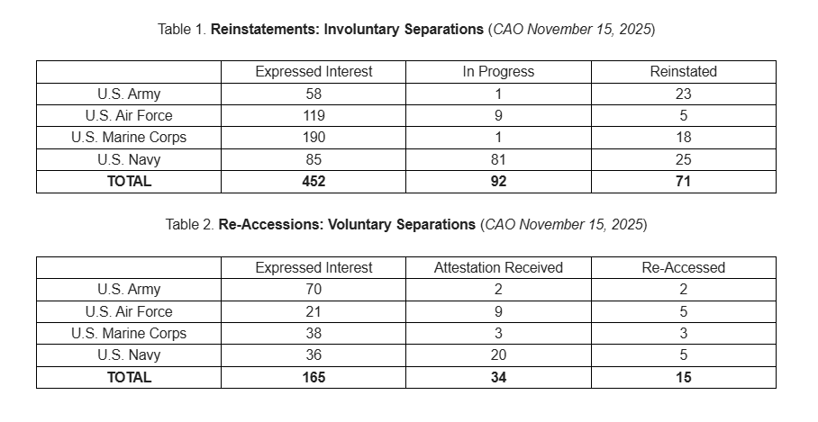 On Oct. 2, Hegseth personally reinstated Army Col. Kevin Bouren and appointed him to lead an Army Covid Reinstatement Task Force. On Nov. 14, Bouren and Undersecretary of War Anthony Tata personally reinstated one of the other few soldiers to make it through so far, Army Capt. Mark Bashaw. Bashaw was retroactively promoted to captain from first lieutenant and reinstated with honors. On Nov. 19, Army Maj. Grant Smith joined Tata’s reinstatement task force.