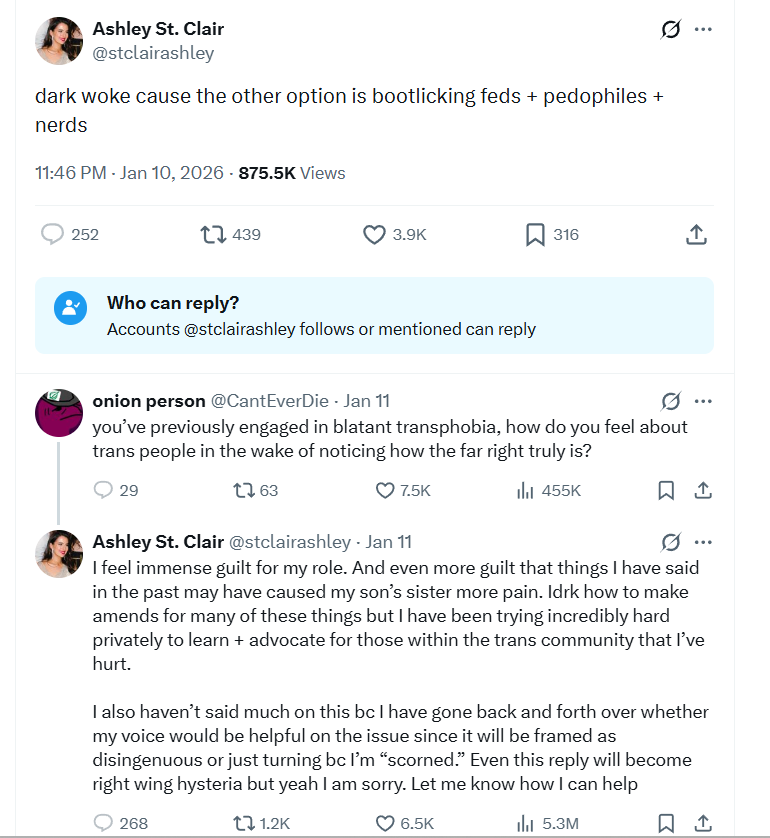 St. Clair (probably deliberately) put a stick in a known sore spot for Musk by connecting these comments to another of his children, who identifies as transgender. Musk has previously said he bought Twitter to fight culture-manipulating internet censorship and propaganda operations after that child of his caught “a woke mind virus” at college and went transgender.