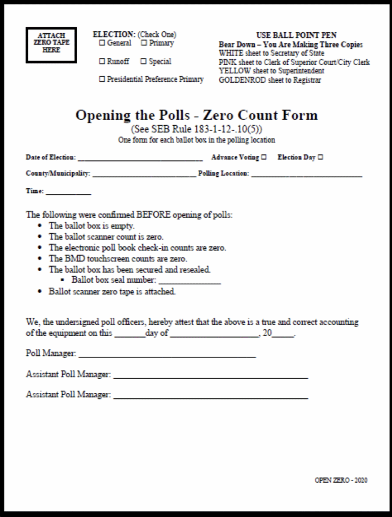 The regulation governing early voting says election workers shall attach the zero tape to a form that “shall be returned to the election superintendent at the close of the advance voting period.” (In Fulton County, the Fulton County Elections Board operates as the elections superintendent.) But the forms used in 2020, which are designed to be used with carbonless paper to create multiple copies in various coded colors, instruct election workers to “attach zero tapes.”