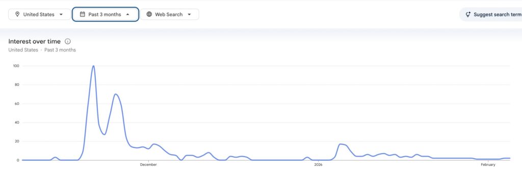 But if the administration’s punitive response to the Seditious Six ends up failing as policy, it absolutely still succeeds as politics. Trump and Hegseth have changed the topic of conversation. No one is now actively considering or advancing the dangerous argument that the armed forces should refuse to obey the orders of their current commander-in-chief. The Democrats who told people serving in the armed forces to disobey “right now” have lost the argument. Google Trends, for the term “illegal orders,” November to February: