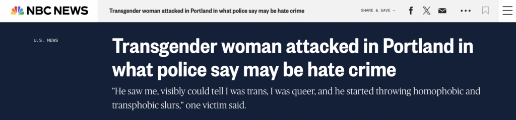 Helsel, too, has deemed a person’s transgender identity newsworthy when it’s politically useful, even falsely describing a man as a woman in a news report to do so. See if you can spot the difference between how Helsel writes about a transgender man who shot people versus one who claimed to be the victim of a “transphobic” attack: