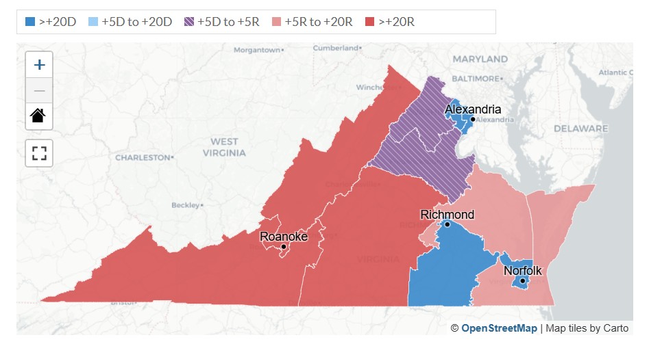 The only Republican district left in the proposed map would be in the southwest region. But even that region, in the proposed 6th District, a slinking cove was created to pick up left-wing college towns in order to force many Republican-leaning central Virginia counties (which currently have Republican representation in Congress) to have Democrat representation.