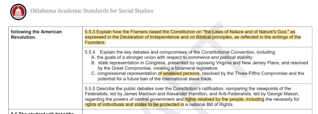 In spring 2025, Oklahoma had almost completed a similar rewrite of its social studies curriculum. The rewrite was a watered-down version of model social studies standards from NAS and the Civics Alliance, a coalition of academics and citizens concerned about accurate, nonpartisan history. Even as altered by education bureaucrats in the state, the new standards would have improved the state’s history curricula.