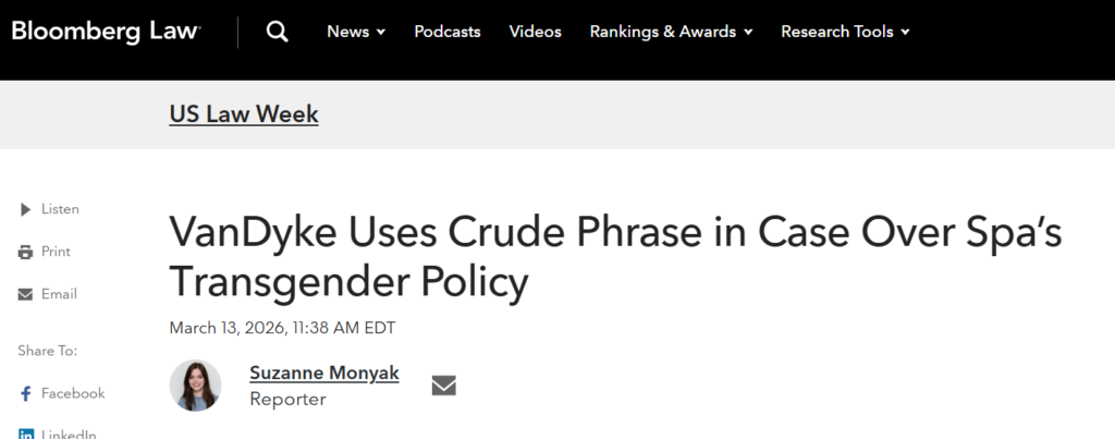 Bloomberg Law’s headline was: “VanDyke Uses Crude Phrase in Case Over Spa’s Transgender Policy.”