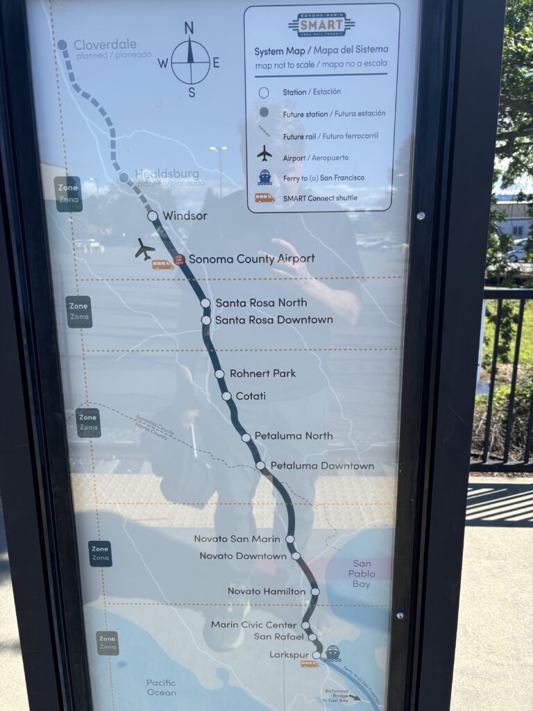 This story also starts in 2008, the year California voters approved a plan to build the bullet train. At the same time, Bay Area voters in suburban Sonoma and Marin counties approved a sales tax increase to partially fund a regional commuter train that would also get state and federal grants, the SMART train: Sonoma-Marin Area Rail Transit. The system, a single north-south line, is still under construction, but the parts that have been built are in service. Yes, Chris Bray appears in this train station photograph.