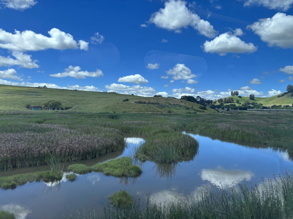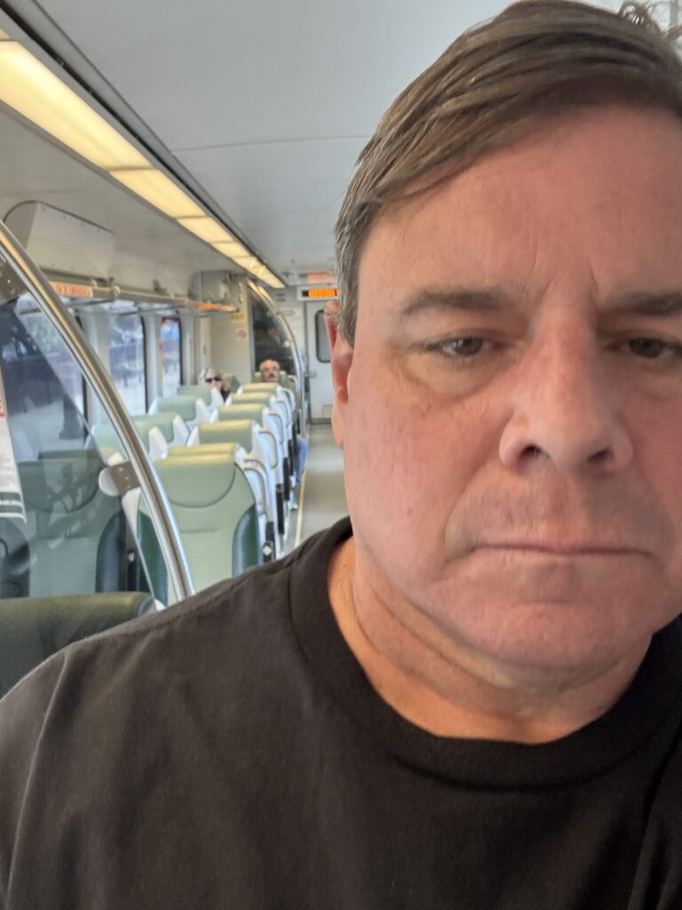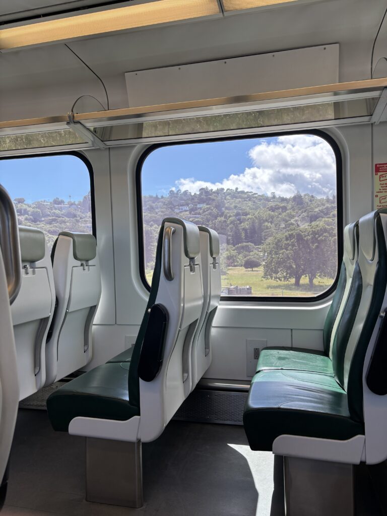 Testing the competing arguments, I rode the train on Monday, from the Santa Rosa airport station in the north to the Larkspur station in the south. Then I rode back. If you wonder why people put up with the unrelenting political madness of California, I took this picture from my seat on the train, and you can see the reflection of the windows from the other side of the train car: