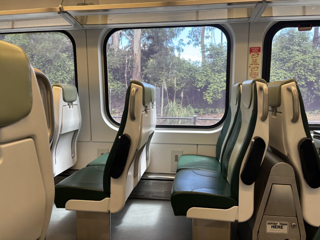 In the afternoon I rode back to Santa Rosa from Larkspur, down on the bay in the southern end of Marin. The train had two cars. Here’s the interior of my car as I prepared to get off at the end of my ride: