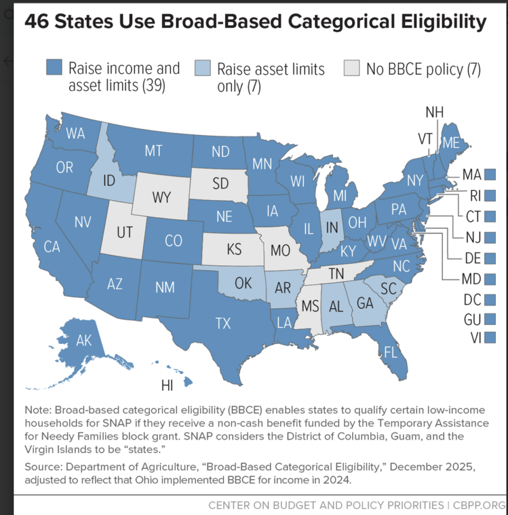 The retiree was volunteering at the Central Minnesota Council on Aging, helping seniors sign up for Medicare plans, when he learned about Broad-Based Categorical Eligibility. The loophole helps states bypass federal food stamp eligibility requirements, specifically income and asset thresholds. The latter limits take into account liquid assets, such as cash on hand or readily available money in bank accounts. Wealth in property, retirement accounts, life insurance, personal goods and other possessions don’t count toward the asset limits.