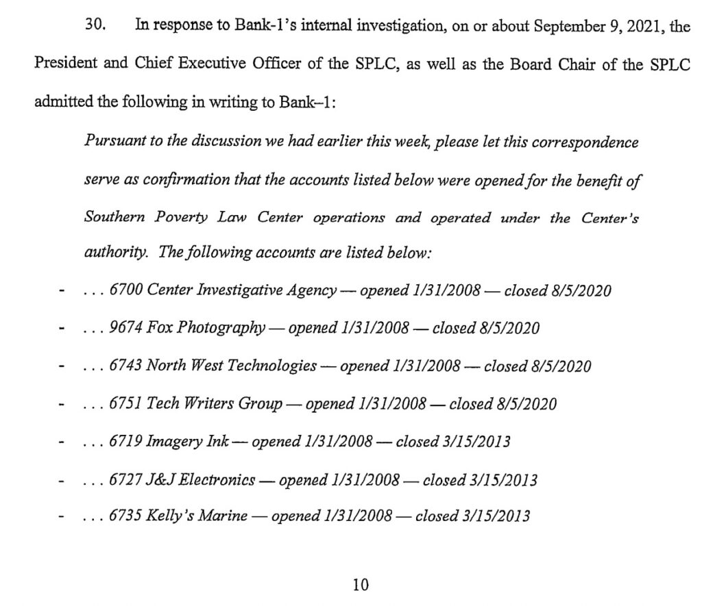 The SPLC allegedly opened bank accounts for fake businesses that didn’t do the type of work those businesses were supposed to be doing: a supposed photography studio that just made payments to informants, a rare books warehouse that just made payments to informants, and so on. Those are the kinds of anomalous transactions that tend to trigger suspicious activity reports, which can end up in front of law enforcement agencies.